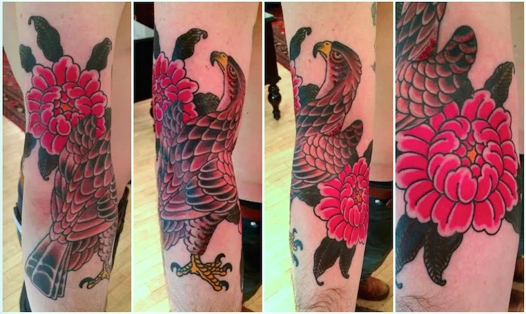 Tibetan style Falcon and Peony flowers for Spencer. January 27, 2015 Fun one I finished a while ago at Kings Avenue Tattoo in Manhattan. Tattoo by Chris O'Donnell 2015