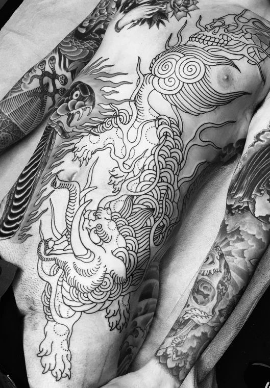 In-progress Baku tattoo... April 20, 2015 For Travis. Private studio session. In-progress tattoo by Chris O'Donnell 2015