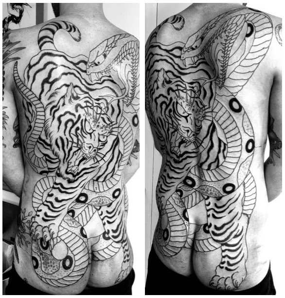 Tiger and Snake back outline for Adrian... August 02, 2015 First session. Done at Kings Ave in Manhattan. More progress soon. In-progress tattoo by Chris O'Donnell 2015