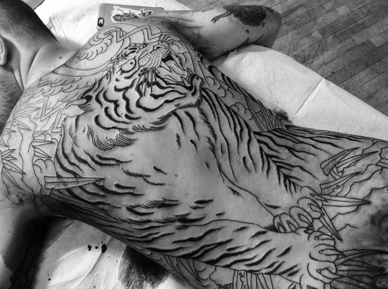 Tiger back piece for Francesco... October 23, 2016 On a tattooer from Italy. 1st session. Kings Avenue Tattoo NYC In-progress tattoo by Chris O'Donnell 2016