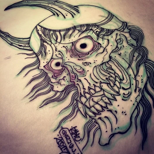 Hannya Skull tattoo mash-up for Eric. January 20, 2017 Rough sketch Tattoo drawing by Chris O'Donnell 2017