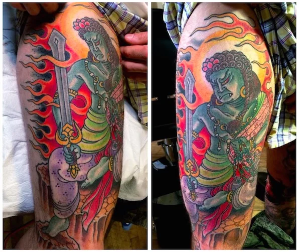 The guardian of Buddhism. 1st session at Kings Avenue Tattoo NYC on Alphonso.