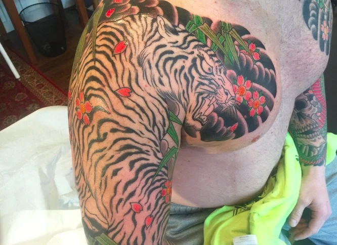 More progress on Ryan's Tiger... March 23, 2016 2nd session. In the private studio. In-progress tattoo by Chris O'Donnell 2016