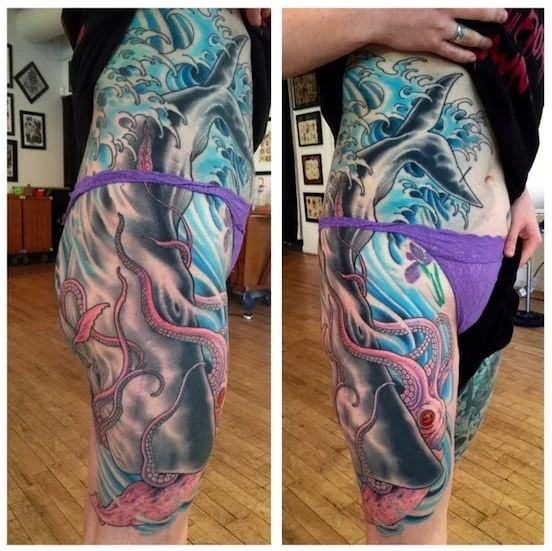Squid and whale battle... January 12, 2016 For Ruthie. Kings Avenue Tattoo NYC Tattoo by Chris O'Donnell 2014, 2015
